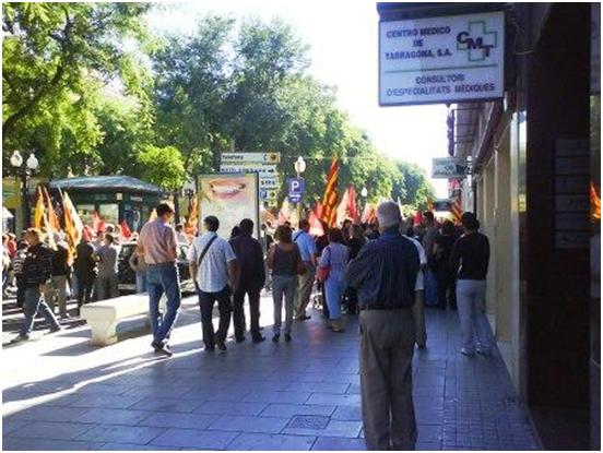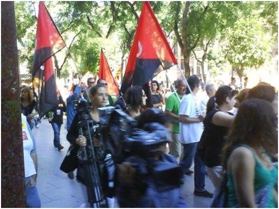 Mucha banderita catalana con la pegatina recién impresa del sindicato en cuestión (lo que vale para el 10 de julio también vale para el 29 de setiembre: estamos en crisis y hay que ahorrar). Recuerden: «lo importante es la foto» y aquí hay que ser sindicalista, pero en català, por más que el jefazo regional de uno de los convocantes sea un xarnego asturianu.
