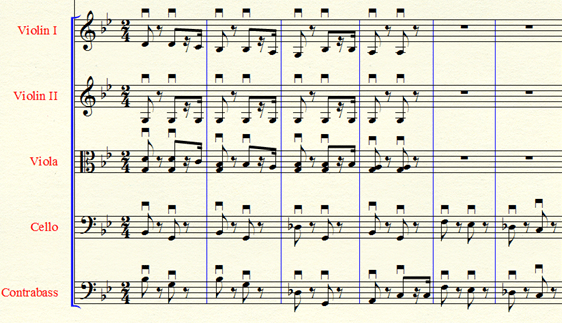 Y nuevamente tenemos una sección que se abre con la melodía de Varshavianka (en España más conocida como «A las mariscadas barricadas») repartida su enunciación entre las cuerdas (cc. 235-241) y las maderas (cc. 335-345). Dejamos la muestra del primer trozo: