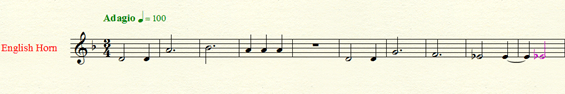 La melodía, con los habituales meandros armónicos, se va desgranando hasta que participan todos los instrumentos de cuerda. Una vez la han tocado todos juntos, en el compás 97 se abre una nueva sección: la música baja medio tono (a Fa sostenido menor) y se vuelve más solemne con la entrada de los metales, más el acompañamiento de clarinetes y contrafagot. Las trompas enuncian este segundo tema: