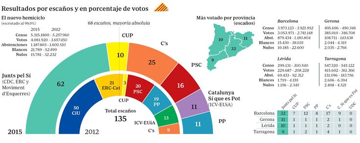 Contando, pues, escaños, un dato salta a la vista: que la coalición Junts pel Sí (que algunos, no sin razón, han rebautizado jocosamente como Junts pel 3%) ha sacado menos escaños que los que tenían por separado en 2012. Si añadimos la presencia de un desconocido hasta ahora Moviment d’Esquerres (que recoge a dos exdiputados díscolos del PSC y consellers, Ernest Maragall y Marina Geli), la diferencia de escaños entre elecciones podría haber sido mayor. No obstante y en términos absolutos, 62 siguen siendo muchos escaños, por más que las televisiones de obediencia genovesa martilleen lo de «muy lejos de la mayoría absoluta». Oigan, que quedarse a 20 escaños sí es muy lejos; pero a 6, más bien poco. Demuestra el poder que tienen los medios de comunicación y la coerción difusa que se ejerce contra los disidentes en Cataluña.