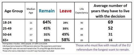 El referéndum ha sido reñido (52% por el Brexit sobre 48% por el Bremain) y, a la vista de cómo se ha planteado, podría decirse que han votado viejos contra jóvenes. Los jóvenes, sabiendo que las cosas pintan color hormiga, votaron Bremain porque estar dentro de la UE —aunque no dentro de la UEM, porque no quisieron perder soberanía sobre su moneda— les reporta la ventaja de la movilidad geográfica, ya sea para estudiar o para trabajar. Si no encuentran trabajo en Liverpool, pueden intentar encontrarlo en Poznan, Bremen, Nantes o Milán. Y si tienen posibilidad de ir a estudiar a Heidelberg, quizá lo prefieran a quedarse en Leeds. Lo mismo se diga de los hoy «extranjeros»: si en Gijón o en Barcelona no hay trabajo, es posible dentro de la UE encontrarlo en Cardiff o Birmingham.