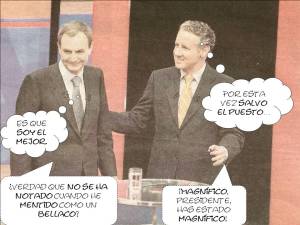 Pero y sobre todo, ZP no escuchó a nadie. No escuchó a los que ya en 2006, como Gestha (el sindicato de los técnicos de Hacienda, que no aprendieron economía en dos tardes y que si de algo saben es de números), avisaban de que no se podían atar los perros con longaniza. O Manuel Pizarro, que en el debate pre-electoral de 2008 con el Profesor Siesta dijo cosas que se han ido cumpliendo punto por punto. La reacción de ZP fue taparles la boca, envolverse en la bandera y llamar antipatriotas a quienes, aun sabiendo poco (como es el caso de un servidor de ustedes) o mucho (caso de Gestha o de Manuel Pizarro), decían que íbamos derechitos a la crisis. Quienes en la blogocosa no nos alineábamos con las tesis de ZP tuvimos que soportar el inmisericorde chorreo de los cyberpepiños y otras hierbas, que nos llamaban fachas (estoy seguro de que si la mitad de esos cyberpepiños supieran exactamente lo que nos llaman cuando dicen fachaaaaaaaaa, se callarían la boca) lo más bonito.